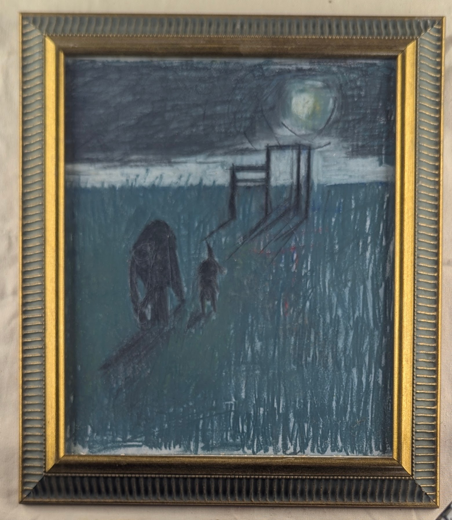 The graphite adds a dimension whe seen at angles is light or dark. The piece speaks for itself. The elements of poetry and the grotesque …everything is equal.